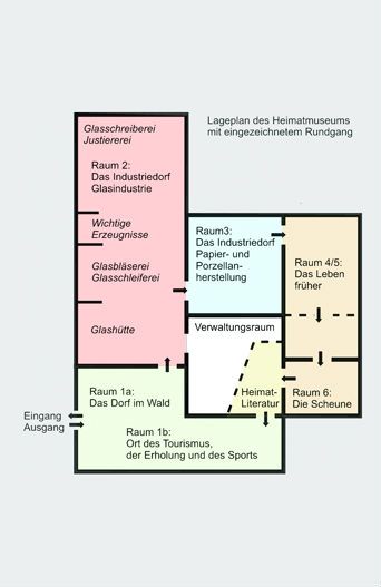 Das Heimatmuseum zeigt dem Besucher anschaulich, wie sich aus einem Dorf von Waldgewerbetreibenden ein Industriedorf entwickelte, dessen Einwohner durch Pionierleistungen eine Glasindustrie von Weltgeltung aufbauen, die jahrelang für Deutschland einmalig war. Der Besucher lernt die einzelnen Stufen dieser Entwicklung kennen, kann sich über historische Arbeitsplätze der Laborglasgeräteherstellung aber auch über die wirtschaftlichen Verbindungen in alle Welt und die Wohnverhältnisse, in denen die Glasarbeiter am Anfang des 20. Jahrhunderts lebten, informieren. Es stellt aber auch Zeugnisse der für das Großherzogtum Sachsen-Weimar bedeutenden Papiermanufaktur und der zeitweise ansässigen Porzellanherstellung sowie typische Waldberufe vergangener Zeiten vor.
